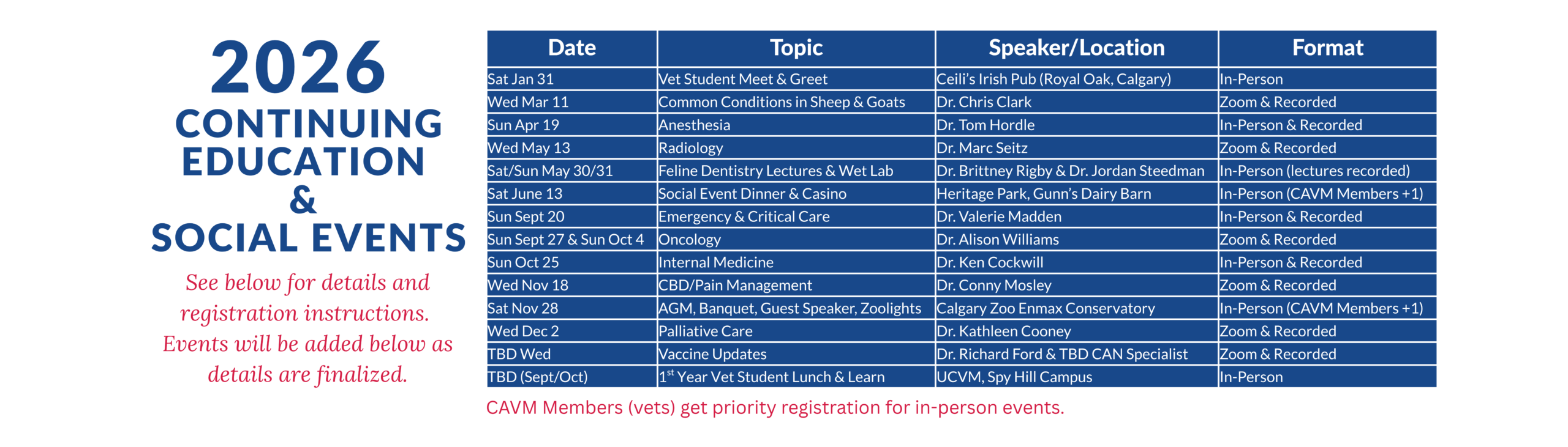 Cancellations & Refunds: For in-person sessions, at least 1 week’s notice is required to receive a full refund unless we have a waiting list and can find someone to take your spot. This is to cover catering and admin costs. Email info@cavm.ab.ca if you require a username/password to login. Please include your first/last name, title, personal email address, and the clinic/province you work at.